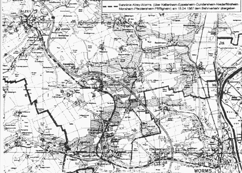 Nach den Beschlüssen des Wiener Kongresses war die heutige Pfalz 1816 an Bayern gefallen. Das nördlich angrenzende Gebiet - heute Rheinhessen - war dem Herzogtum Hessen- Darmstadt zugesprochen worden. In Worms war die Grenze zwischen beiden Territorien. Während Bayern an der verkehrstechnischen Entwicklung ihres linksrheinischen Gebietes aus Konkurrenzgründen zum rechtsrheinischen Baden interessiert war, verlief die Eisenbahnentwicklung im linksrheinischen Rheinhessen eher zögerlich, da die Regierung im Großherzogtum Hessen- Darmstadt mehr an einer Eisenbahnlinie rechtsrheinisch zwischen Frankfurt und Basel interessiert war mit Anschluss an Bahnlinien in Oberhessen (3).