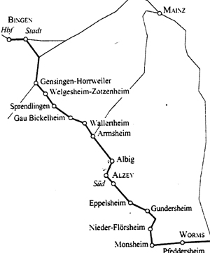 Von den in den 60iger Jahren des vorigen Jahrhunderts beginnenden Streckenstilllegungen blieb die Rheinhessenbahn von Worms über Alzey bis Bingen-Stadt im Gegensatz zu zahlreichen anderen Nebenstrecken verschont (4).